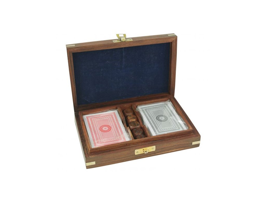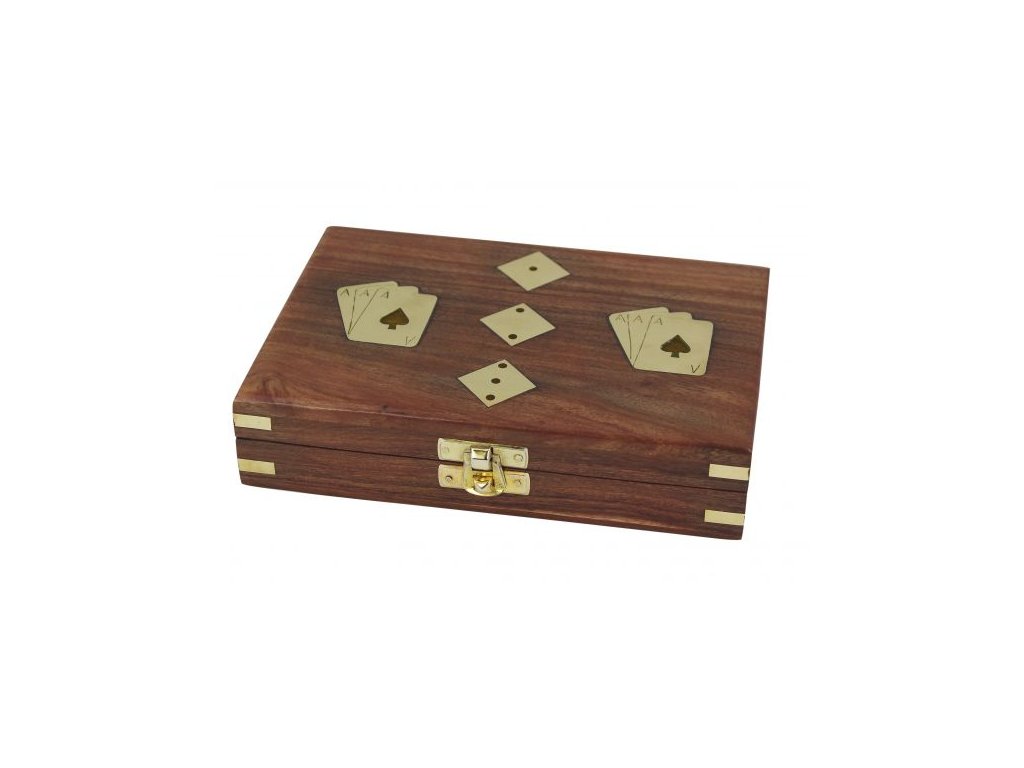 Sada karet a hrací kostky v ozdobné, dřevěné krabičce.